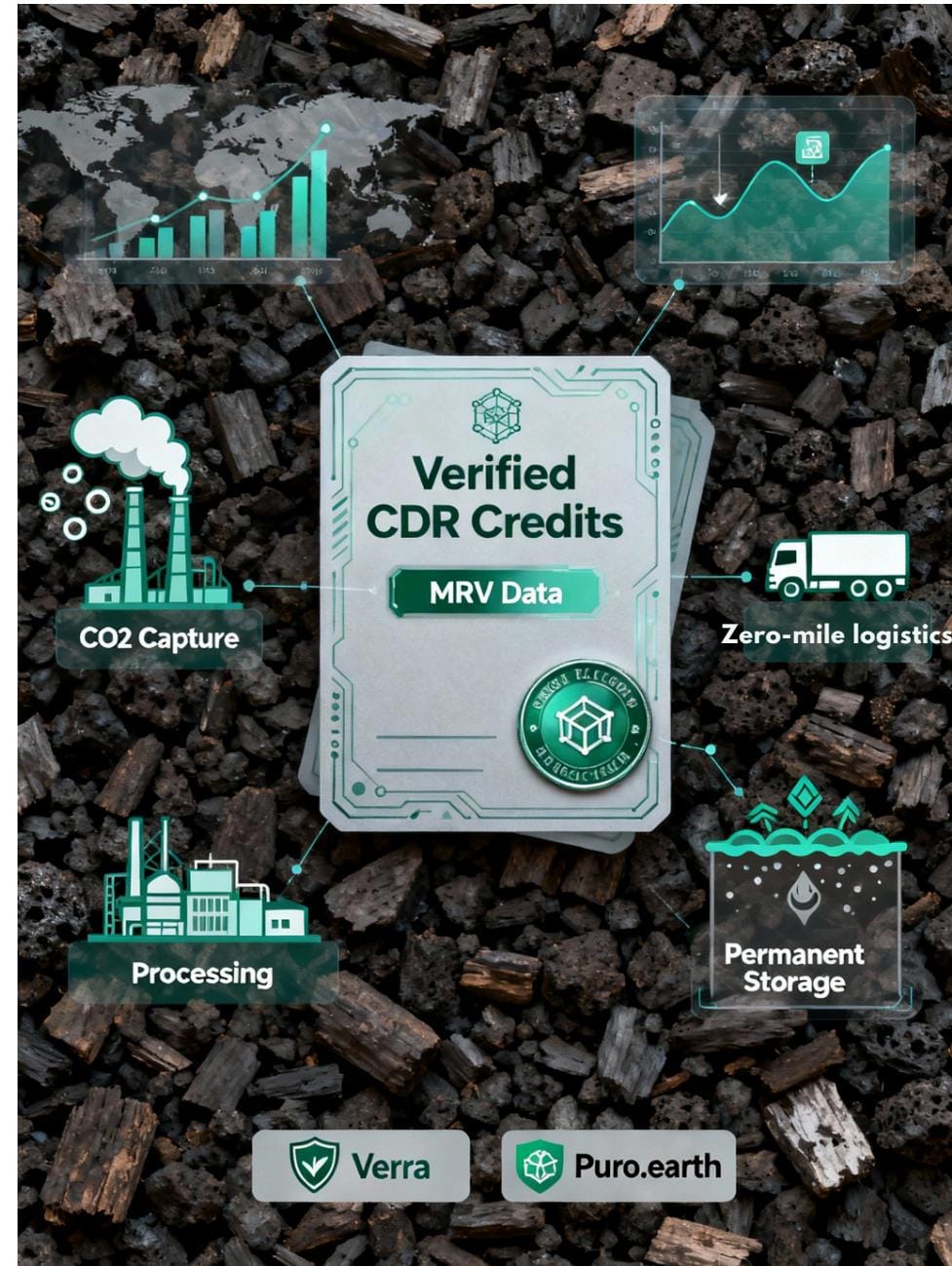Under rigorous MRV (Monitoring, Reporting & Verification) protocols, each ton of biochar delivers approximately 2.6 tons of verified CO2 removal, enabling high-integrity, premium Carbon Dioxide Removal (CDR) credits for global carbon markets. Our credits are verified under internationally recognized standards including Verra VM0044 and Puro.earth, ensuring transparency, permanence, and credibility.